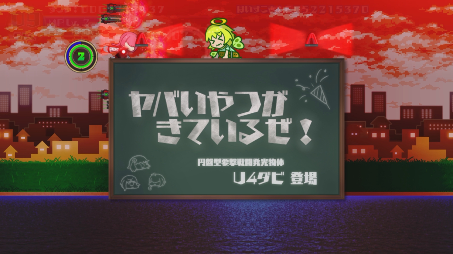 RPG制作ソフト「WOLF RPGエディター(通称ウディタ)」で作られた横弾幕シュー…なのだが、そう言われなければとてもウディタ制だとは気付けないくらいビジュアルも内容もしっかり弾幕しているゲームである。私の知る多くのウディタ制STGというモノは、動作軽量化のために敵や敵弾の表示数を少なくしたせいで画面が寂しくなるか、見た目を派手で豪華にした代わりに処理が死ぬほど重くなってしまったかのどちらかだ。こんなにも大量の敵弾を描画しつつスコアやゲージ類のリフレッシュを高速で行うなどいったいどうやってるのか見当もつかん。