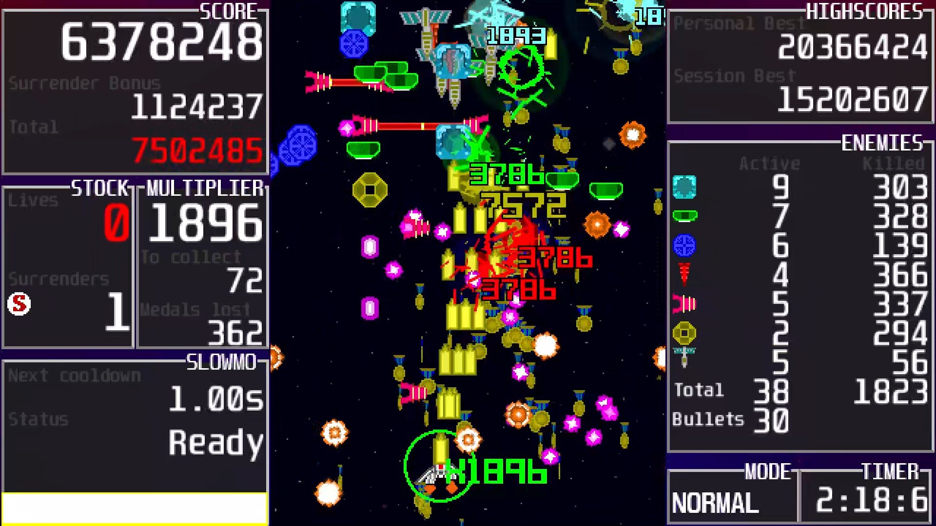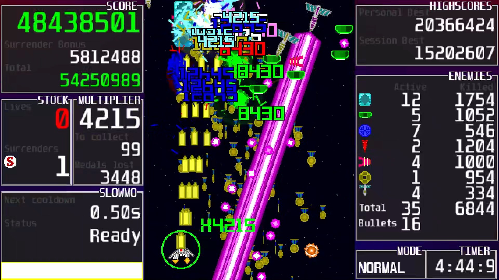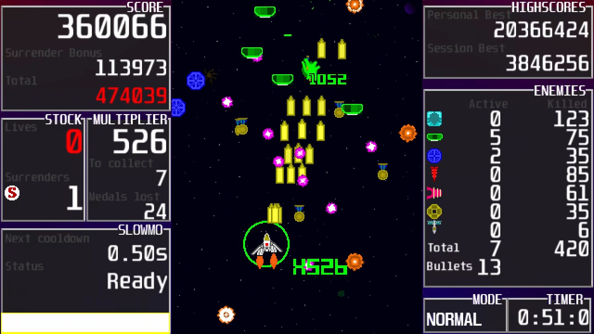 無論、その判断がどれだけ難しいかは普段STGをやっている者ならばじゅうぶんに分かるだろう。だからこそ沼る。何度もプレイしたくなる。降伏ボタンを押せずに終わったときは「あの時押していれば」と思うし、降伏ボタンを押せたとしても「いや今のはもうちょいいけたか?」みたいな考えがどうしてもムラムラ湧いてくる。ゲーム自体はとてもシンプルで1プレイ数分で終わるような内容なのに気が付けば何時間も遊んでしまうのだ。ただのスコアタゲーにちょっとしたアイデアをほんのひとつ加えただけで途端にゲームとしての可能性が広がる。これはとてもクールなゲームデザインだ。